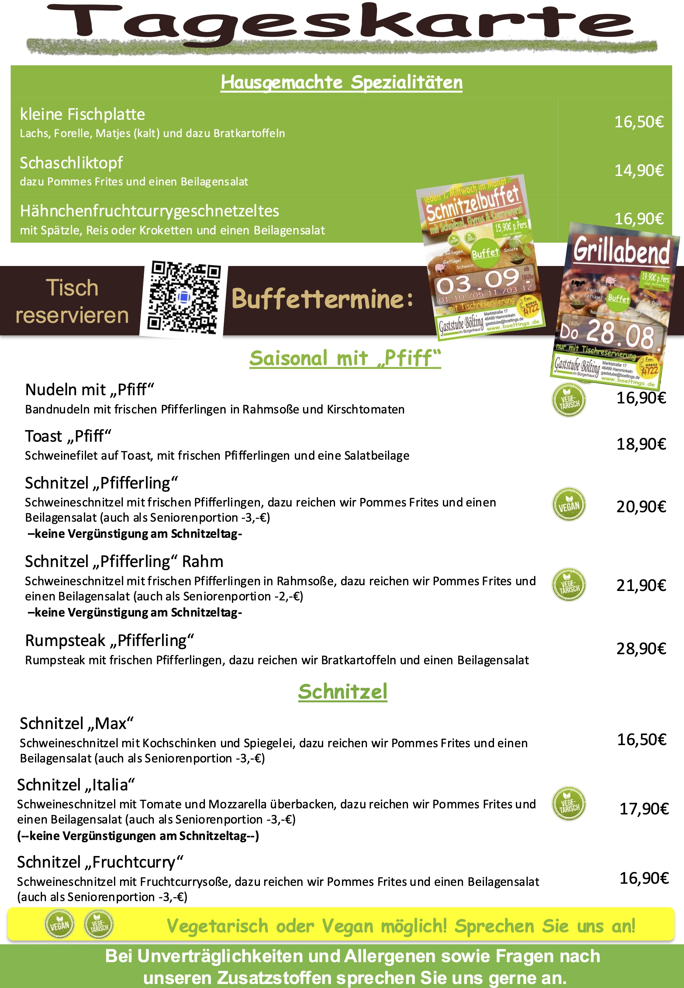 Zu unserer normalen Speisekarte gibt es noch unsere Tageskarte, mit saisonalen und gutbürgerlichen Gerichten aus Mutters Küche.